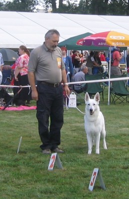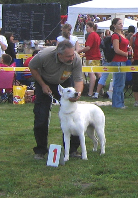 Dnes naše Elza po delší ,, zdravotní " přestávce absolvovala i přes viditelnou nechuť se předvádět, zdárně výstavu ve třídě šampionů s oceněním V1 - CAC, kdy postoupila do dalšího kola o nejhezčí fenu pllemene a soutěžila s nejhezčím, dlouhosrstým psem Dragonem La Blankpapilio o titul BOB a vítěz výstavy. Přesto, že se panu rozhodčímu líbili oba, vybral a zadal ocenění dlohosrstému psu Dragonovi. Pro nás to však nebyla porážka, spíš naopak. Byla to čest soupeřit v takové konkurenci, jako se sešla na výstavě v Mladé boleslavi a dostat se až do posledního kola soutěže. Domů jsme odjížděli plni dojmů a také jsme měli možnost se setkat s prima lidičkama z klubu Bílého ovčáka a také s přáteli a Apolem z Nového Malína, kterého jsme si vybrali, jako krycího psa a možného budoucího otce štěňat naší Elzy.